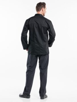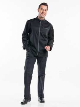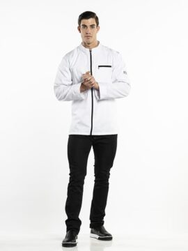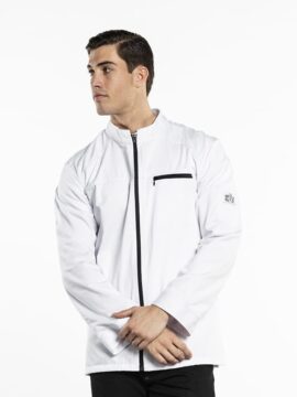 Koksbuis Modena in de kleuren wit 936 en zwart 926 met  contrasterende kleur rits middenvoor. Uitvoering: 50%PL/50%CO Satin Cooltex. De Modena is een strakke, stoere koksbuis, afgewerkt met contrasterende zwarte ritsen. De koksbuis heeft een borstzakje met rits en valt op door zijn elegante eenvoud. Straight Fit. Satin Cooltex – Easy Iron.