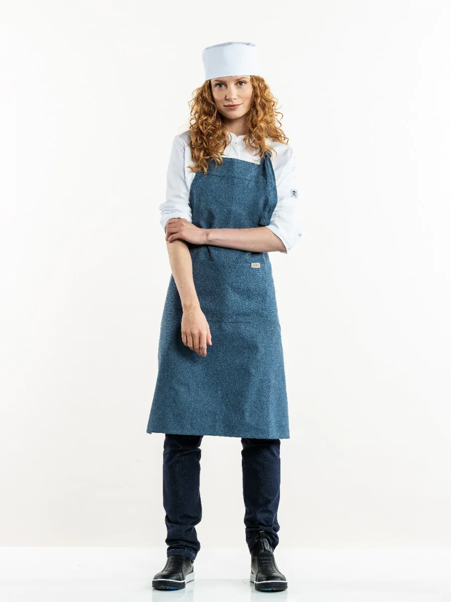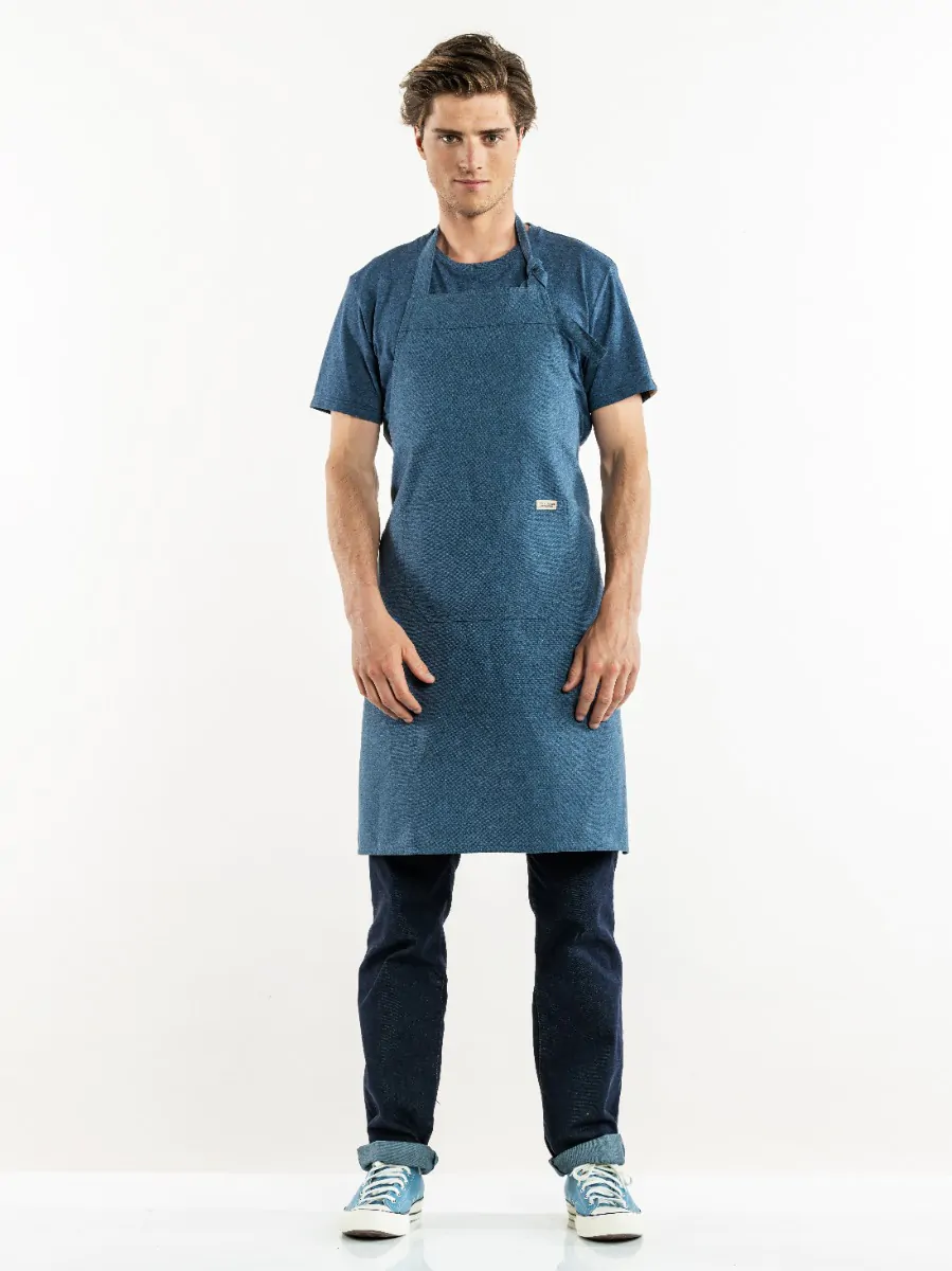 Chaud Devant Schort Amar Blue Melee 50299 W75 – L90. Dit praktische Schort Amar voor de keukenbrigade en bediening heeft een handige zak voorop en een verstelbare band in de nek.