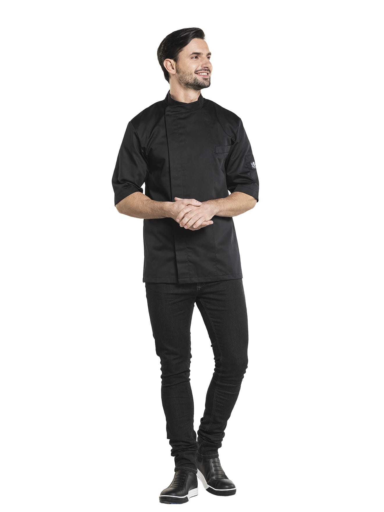 Chaud Devant koksbuis Bacio wit 938 en zwart 939. Recht gesneden koksbuis met op de borst een paspelzak. Vervaardigd van polyester/katoenen stof (Satin Cooltex). Korte mouw. De Bacio is een uitstekende ‘basic’ jas, maar doet daarbij niet onder in luxe. De blinde sluiting maakt een chique, maar subtiele indruk. Less is absoluut More, wat betreft de Bacio. De korte mouwen geven de jas een zomerse uitstraling. De Franse manchetten zijn zowel elegant als praktisch. De satijnen Cooltex stof zorgt dat de stof van de Bacio koksbuis ademt en ook op de drukste momenten comfortabel en koel blijft aanvoelen. Straight Fit. Satin Cooltex – Easy Iron. Materiaal: 50% polyester/50% katoen. Rechte pasvorm. Voor het compleet maken van uw kokskleding kijk bij de Chaud Devant collecties; koksbroeken, koksmutsen, schorten alsmede veiligheidsschoenen.