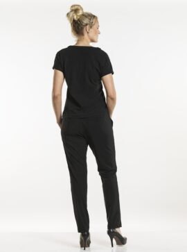 Sense Chaud Devant Top Saffron Black 824. Deze top met korte mouw wordt gekenmerkt door de fraaie en een verfijnde diepe V-halslijn. Deze verleent het ogenschijnlijk eenvoudige design mooie, elegante vormen. De wat ruimere pasvorm van deze top zorgt voor veel bewegingsvrijheid, zonder in te leveren op vrouwelijkheid en stijl. Blouson fit, oversized model met verlaagde schouders. Zeer comfortabel. Zie ook al onze bedieningskleding