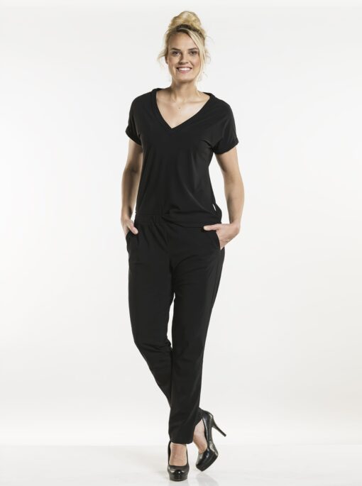 Sense Chaud Devant Top Saffron Black 824. Deze top met korte mouw wordt gekenmerkt door de fraaie en een verfijnde diepe V-halslijn. Deze verleent het ogenschijnlijk eenvoudige design mooie, elegante vormen. De wat ruimere pasvorm van deze top zorgt voor veel bewegingsvrijheid, zonder in te leveren op vrouwelijkheid en stijl. Blouson fit, oversized model met verlaagde schouders. Zeer comfortabel. Zie ook al onze bedieningskleding